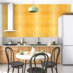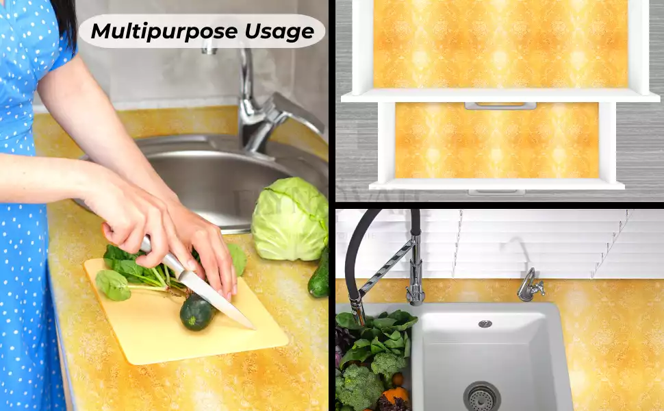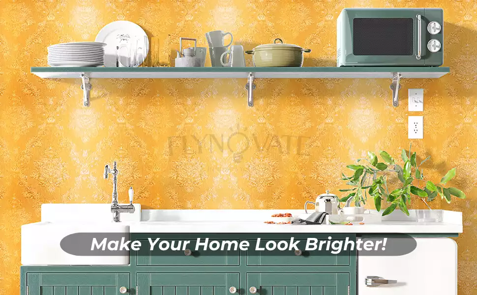 Durable and Beautiful: Transform your kitchen with stylish Golden 3D Wallpaper, Enhancing brightness and cleanliness while protecting walls and wooden furniture from rust & corrosion.