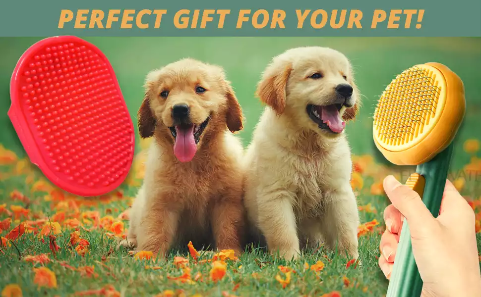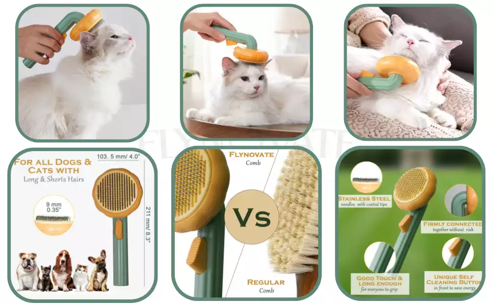 Flynovate Self cleaning Pet comb with FREE Bath Brush – Pet Hair Remover Grooming Comb with Switch & PAIN – FREE Slickers